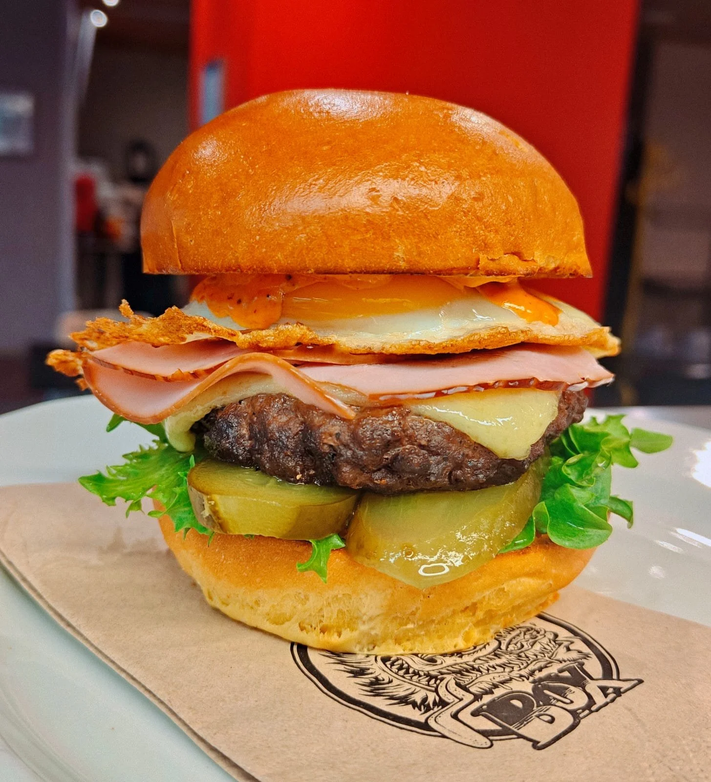 Roslundin naudanjauhelihapihvi, paistettu kananmuna, palvikinkku, cheddar, talonmajoneesi, salaatti ja suolakurkku